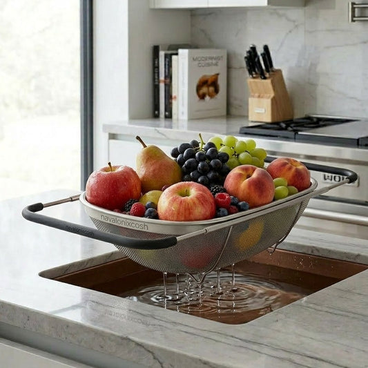 Navalonixcosh Over-the-Sink Stainless Steel Colander - Premium Extendable Mesh Strainer for Fruit, Vegetables & Pasta - Professional Grade Kitchen Essentials